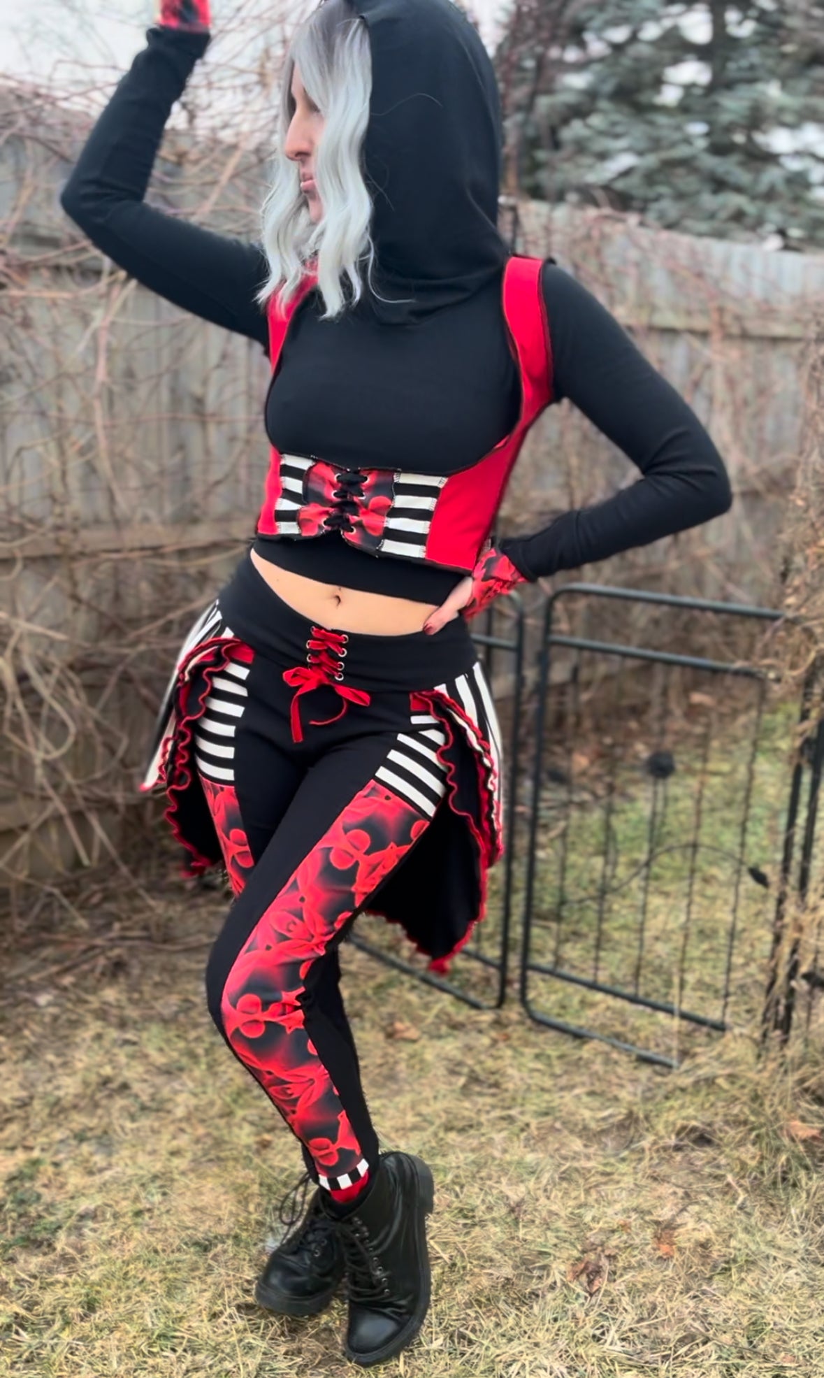 This cowl shaped, hooded tank top is made with black Bamboo French Terry, stretch fabric. This specific top is cut to be cropped. The edges are intentionally unfinished to display a certain aesthetic. Measurements- bust: 33” waist: 27”