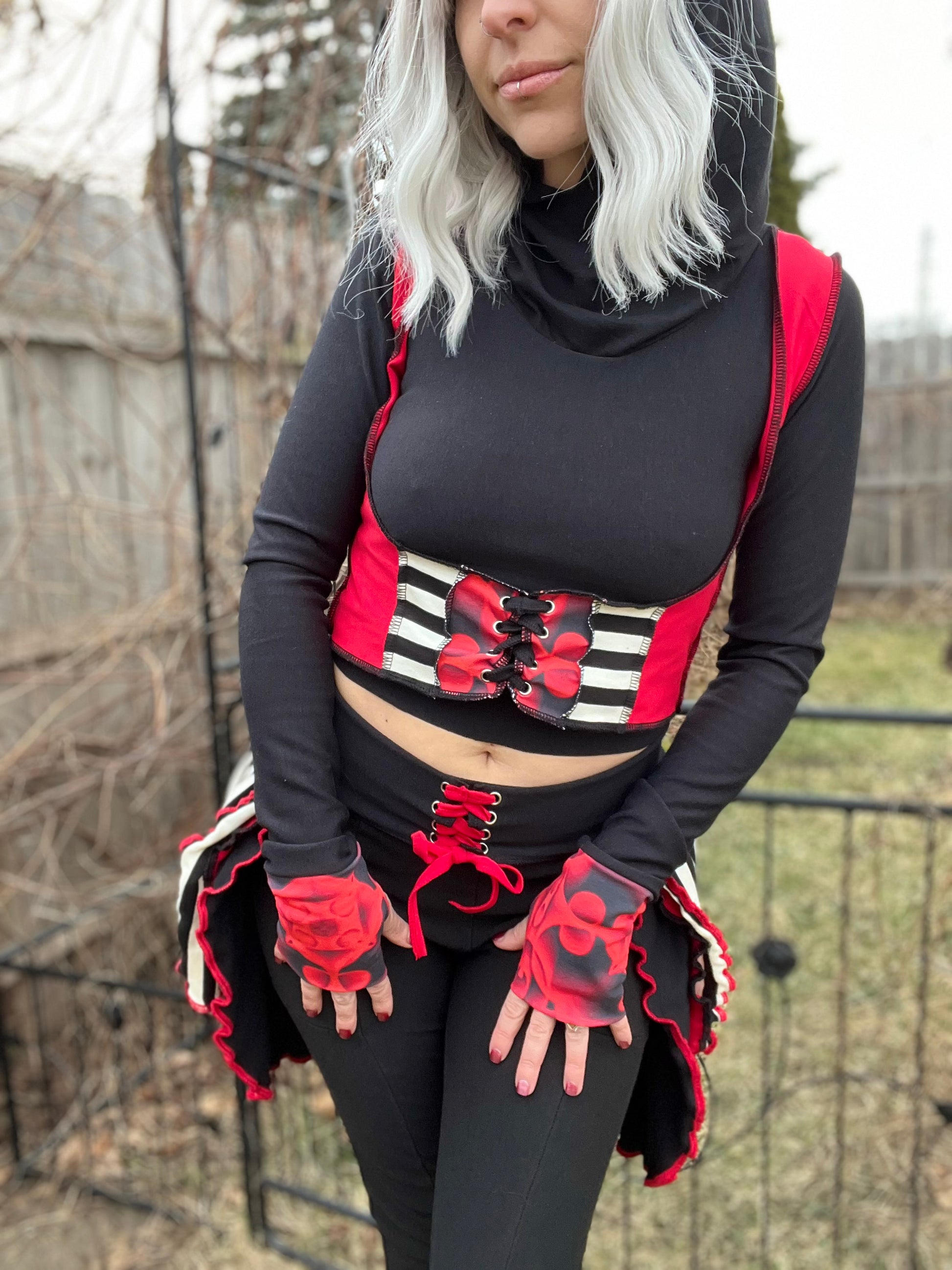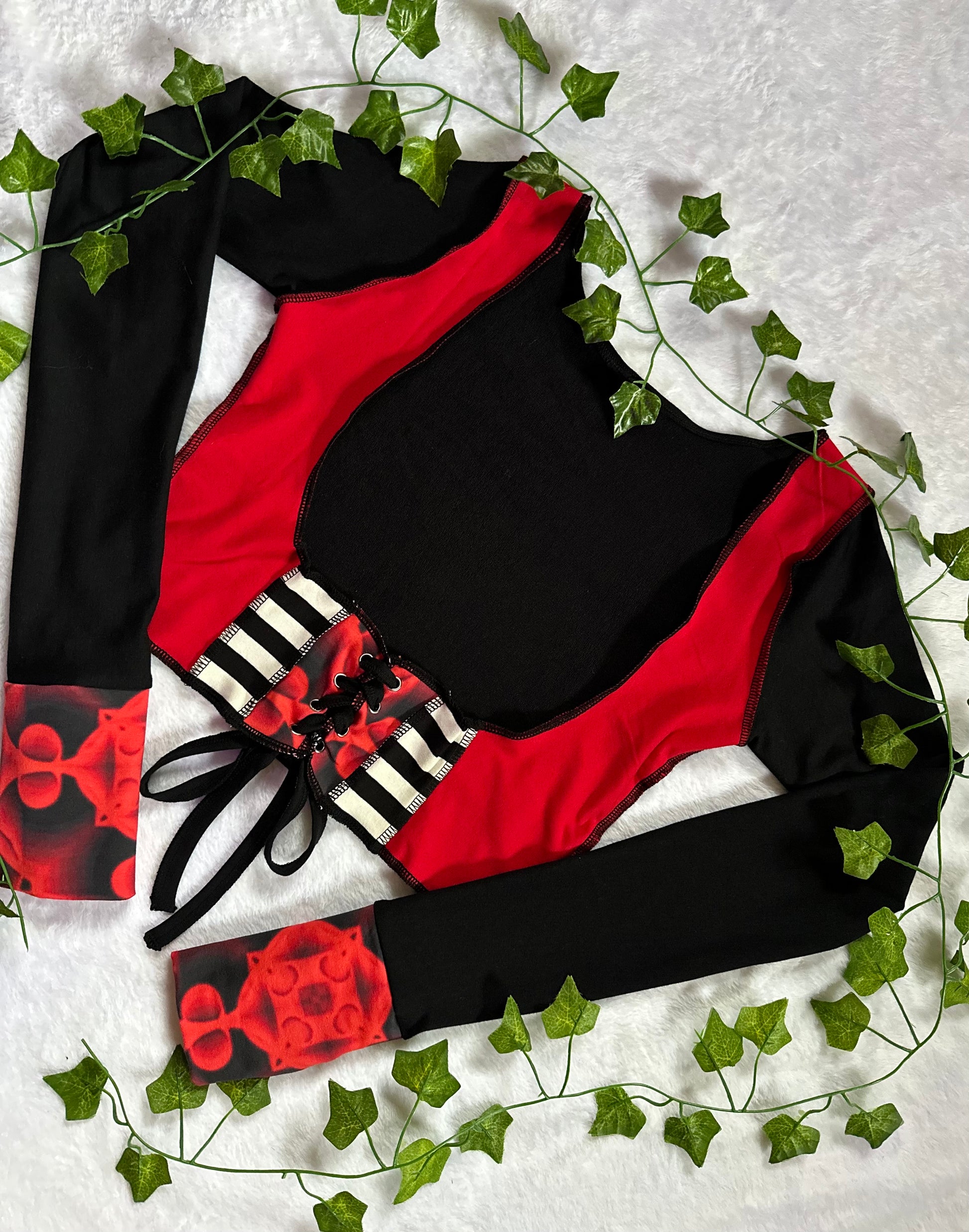 This one of a kind patchwork under-bust is made with long sleeves, open thumbholes and an adjustable corset for extra comfort. Measurements- bust: 37” waist: 31”